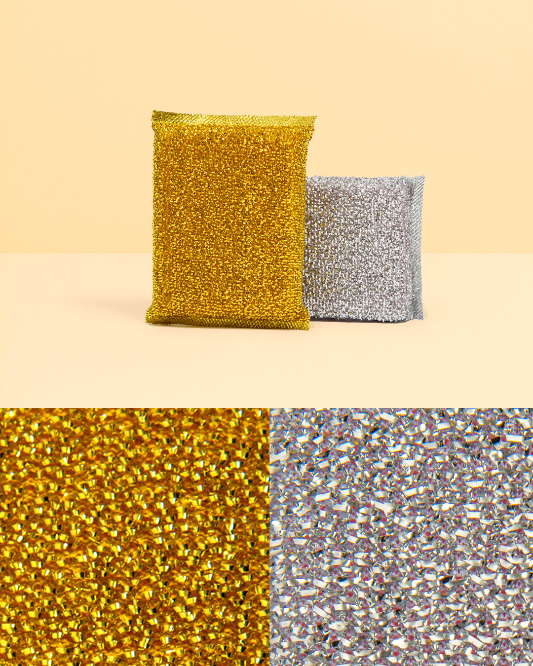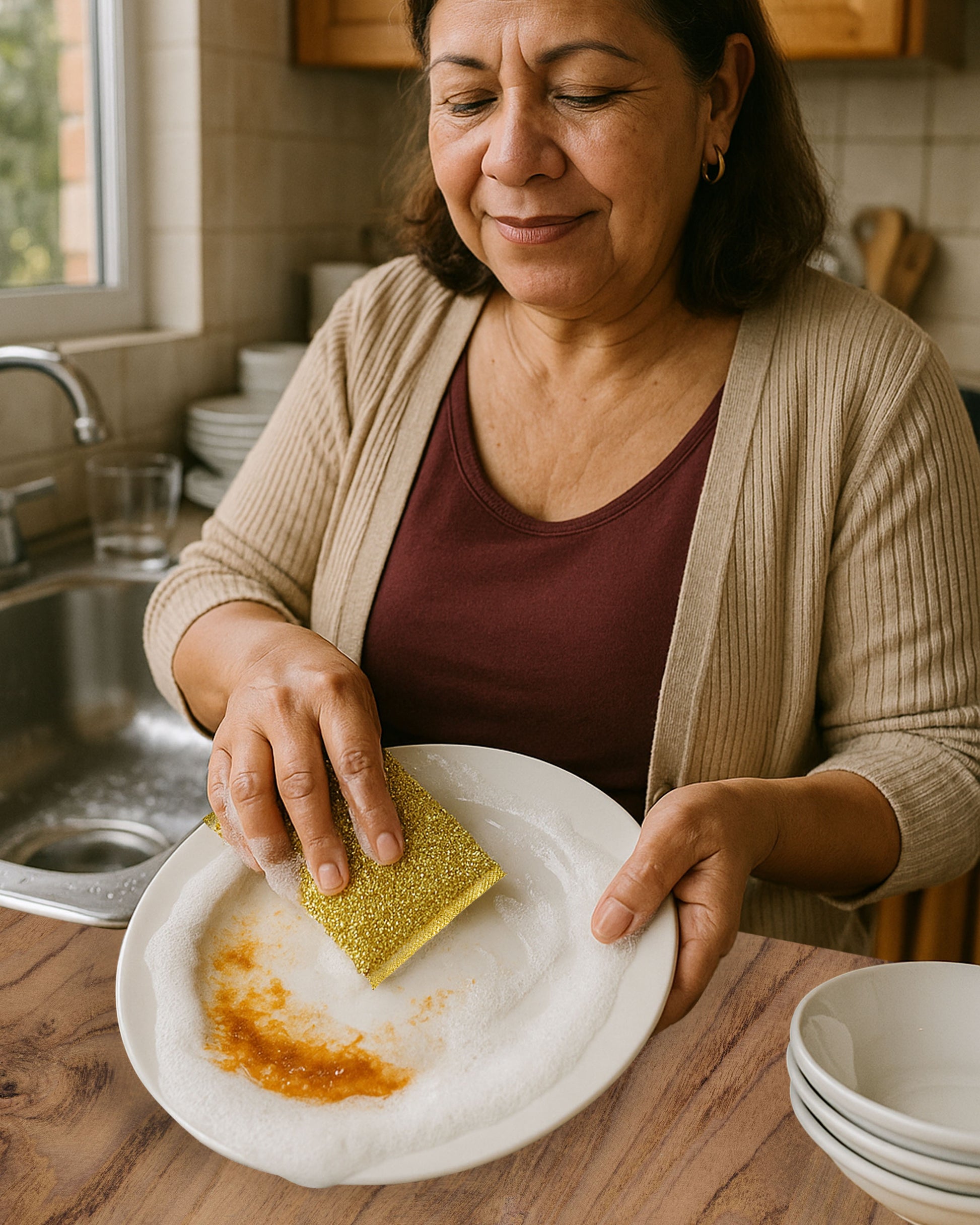 Disponible en colores dorado, plateado, azul o rojo, es perfecta para limpiar superficies delicadas y medias sin rayarlas, manteniendo la durabilidad y eficacia que caracteriza a Fregona.