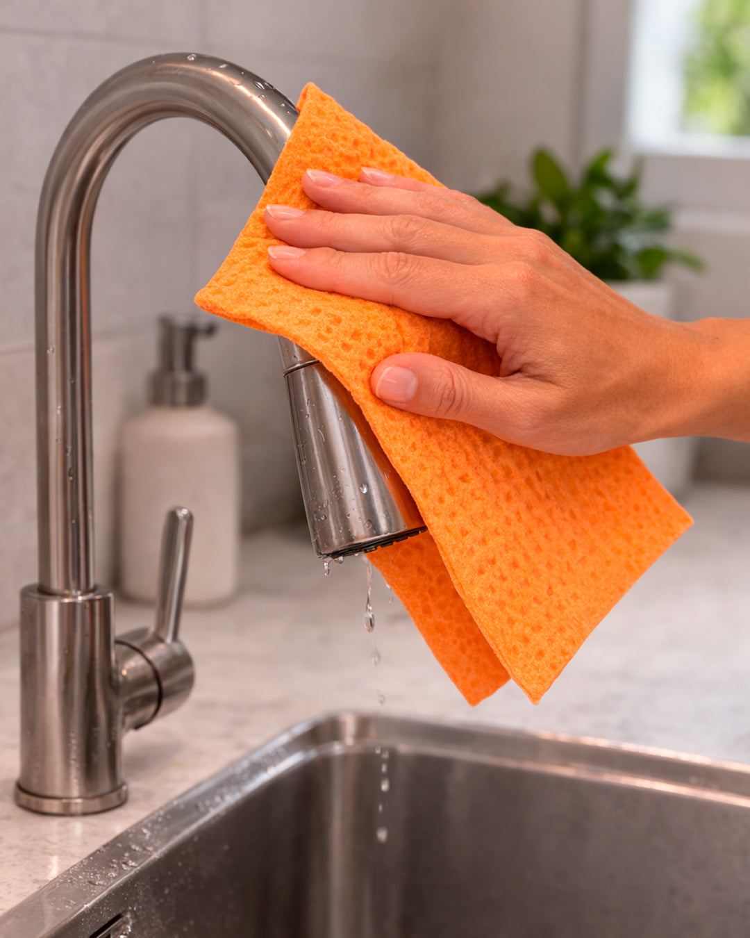 Paño de celulosa que absorbe 7 veces su peso. Puede ser sobre una grifería secado final para que no queden rastros de agua.